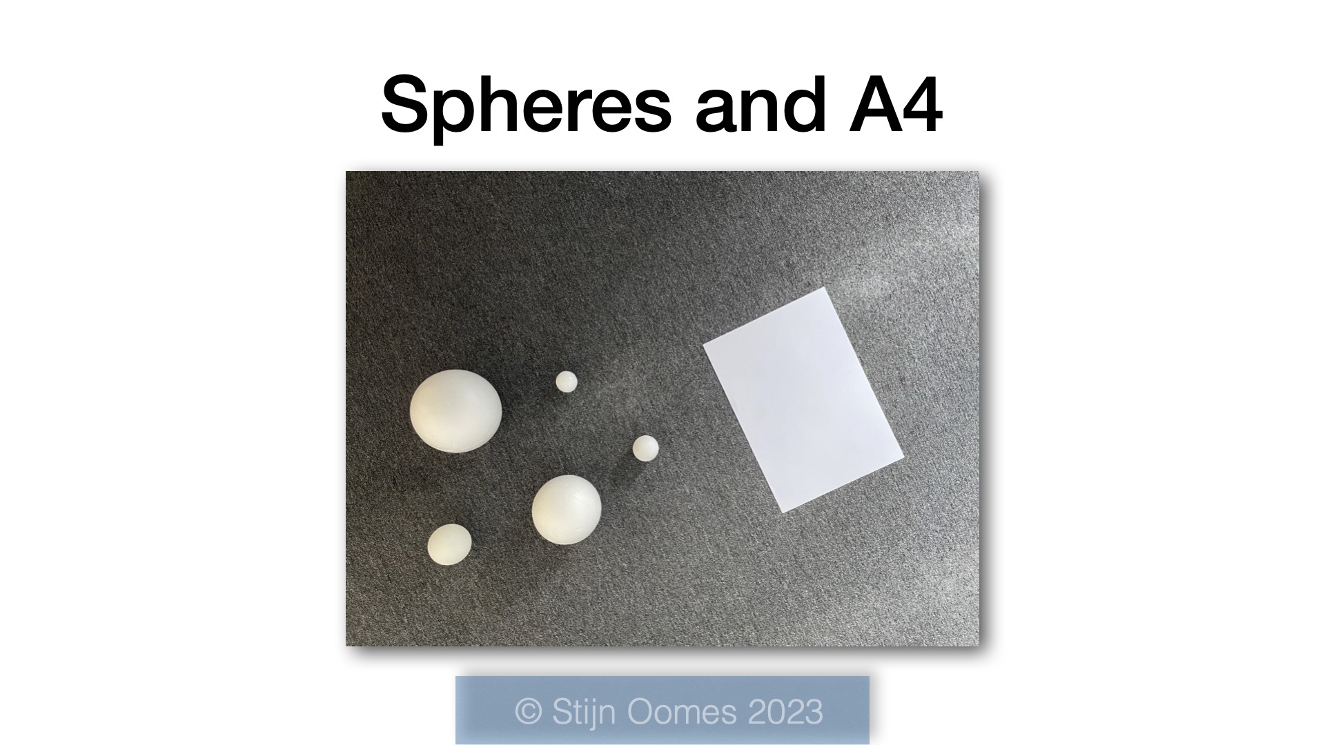I measured the diameter of the three smaller spheres with a calliper. It is not big enough to measure the diameter of the two larger spheres so in that case I just trusted the supplier of these styrofoam balls. (I admit, I should devise a method to measure their diameters properly.)